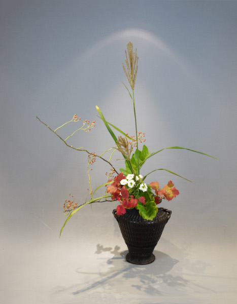 Ein Bambus-Vasen- oder Bambus-Korb-Arrangement hat immer den jeweiligen Grundstil, Moribana oder Heika, als Grundlage.
